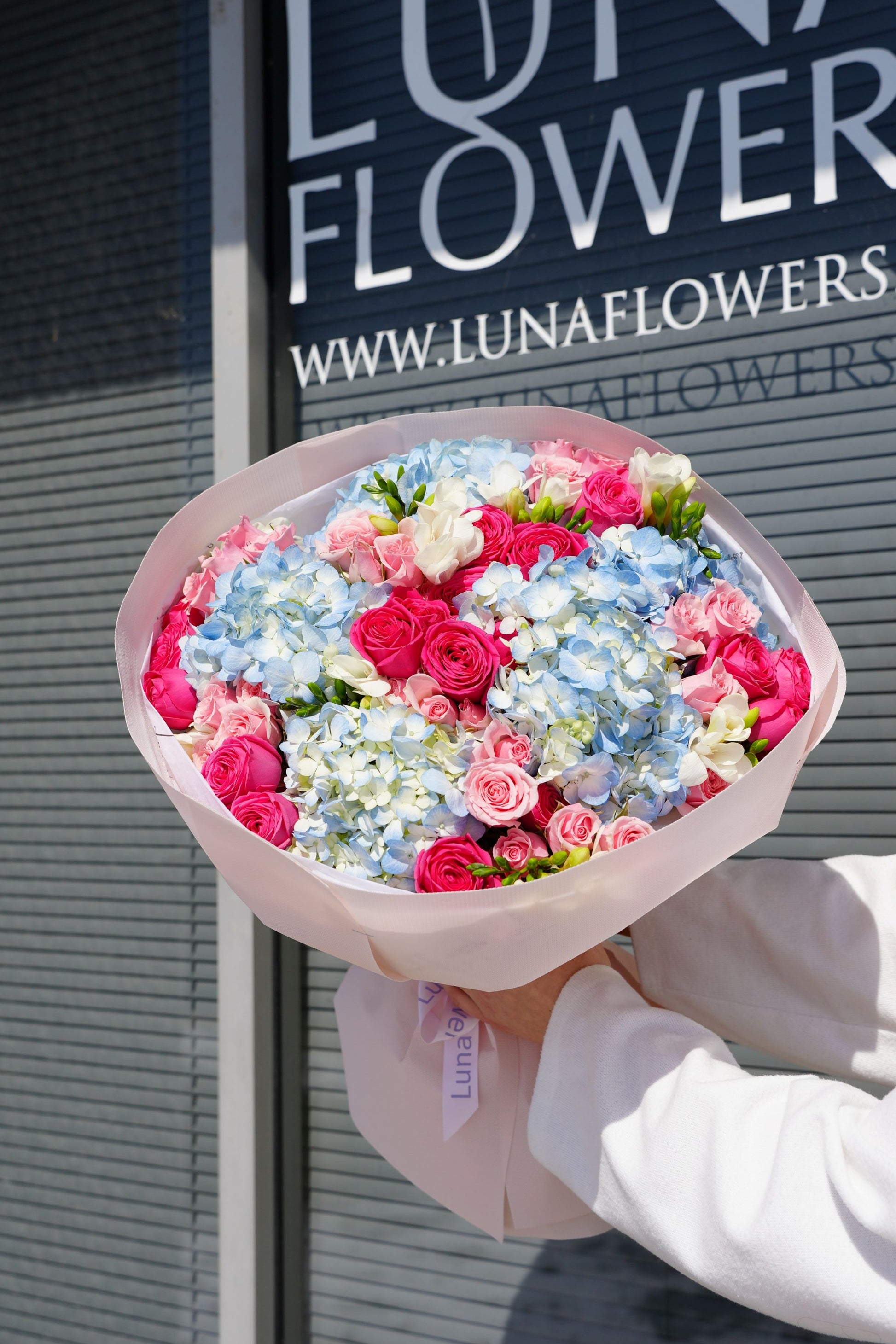 Soft blue hydrangeas paired with vibrant pink roses create a fresh, airy bouquet with a modern, romantic feel.